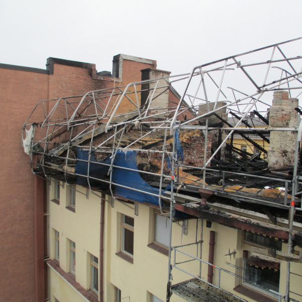 The attic fire and following fire extinction work caused large-scale damages to the structure, stairways and upper-floor apartments of As Oy Pursimiehenkatu 21.